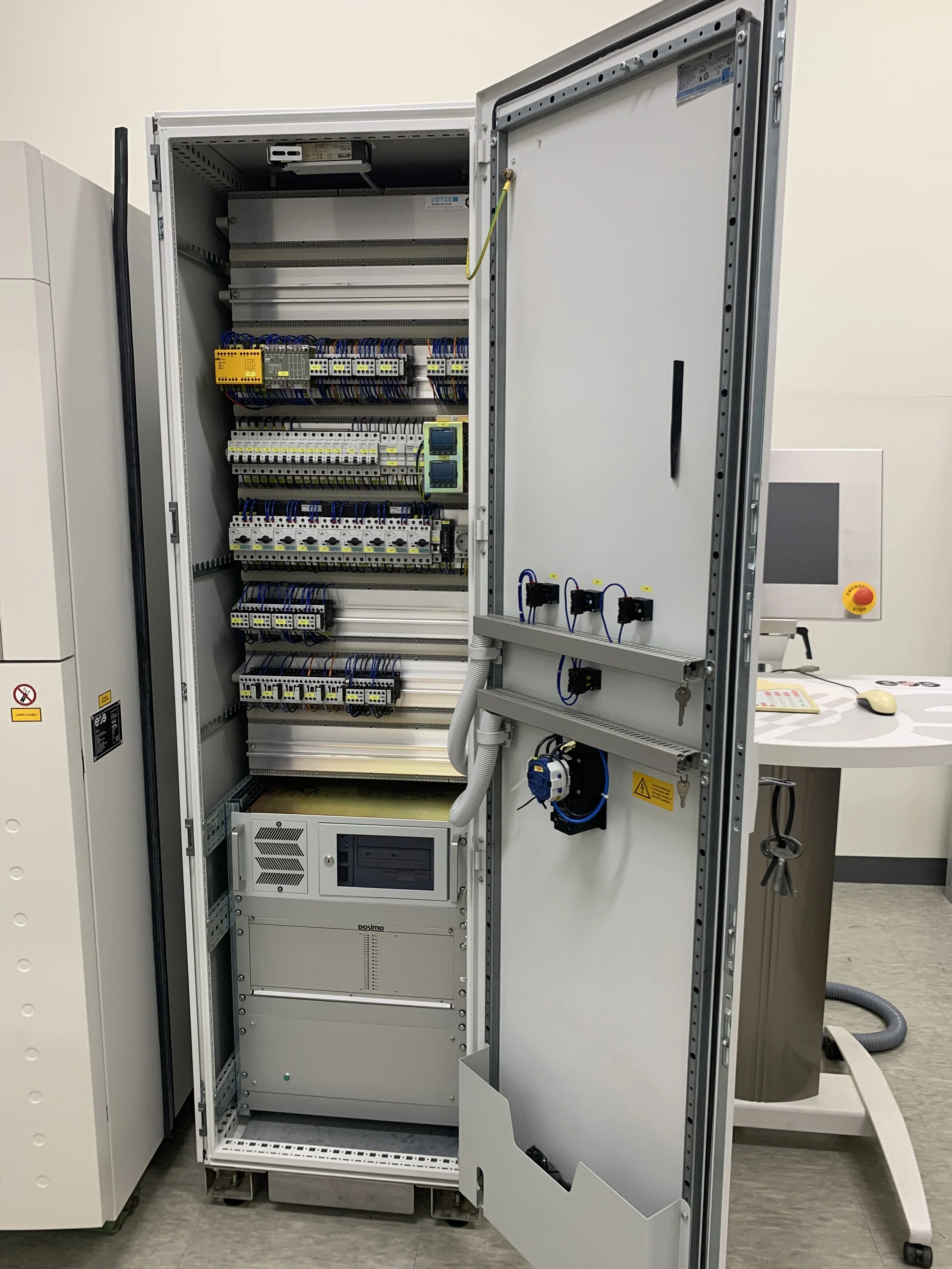 Inside switching cabinet showing all electronics, relays, computer and laser power supply